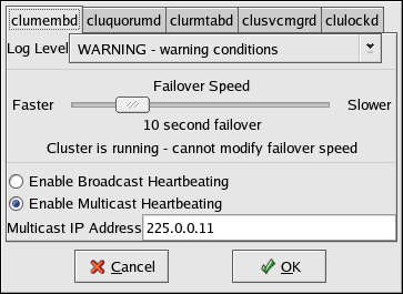 Multicast IP Address — Specifies the IP address to be used by the clumembd daemon over the multicast channel. This field is not editable if Enable Broadcast Heartbeating is checked. The default multicast IP address used by the cluster is 225.0.0.11.