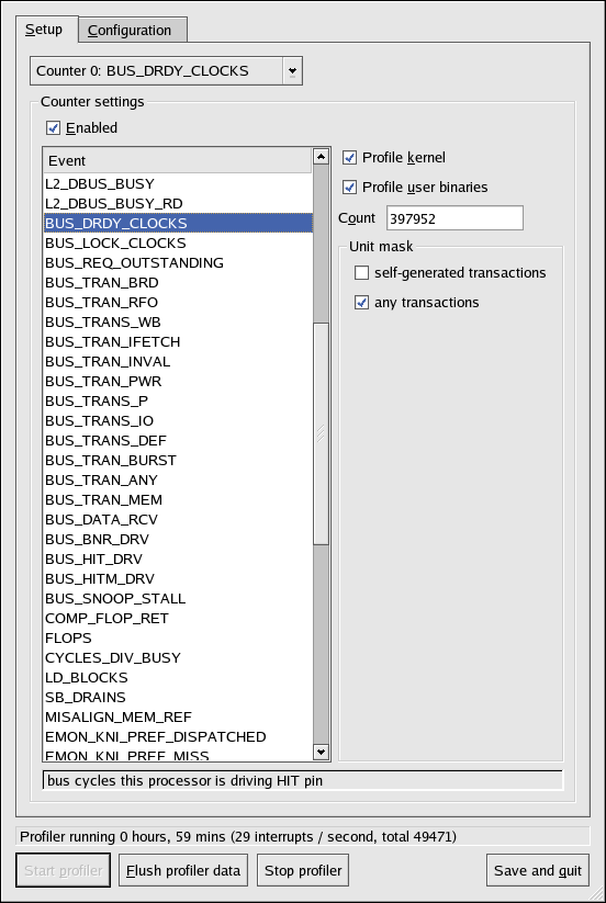 On the Setup tab, to set events for the processor counters as discussed in Section 31.2.2 Setting Events to Monitor, select the counter from the pulldown menu and select the event from the list. A brief description of the event appears in the text box below the list. Only events available for the specific counter and the specific architecture are displayed. The interface also displays whether the profiler is running and some brief statistics about it.